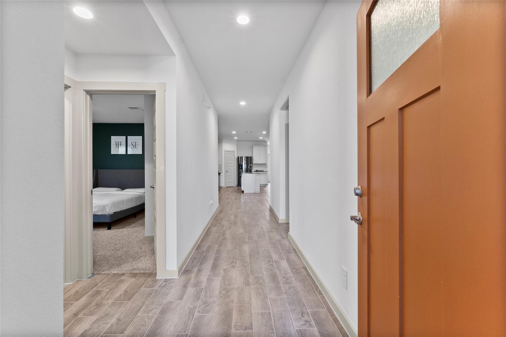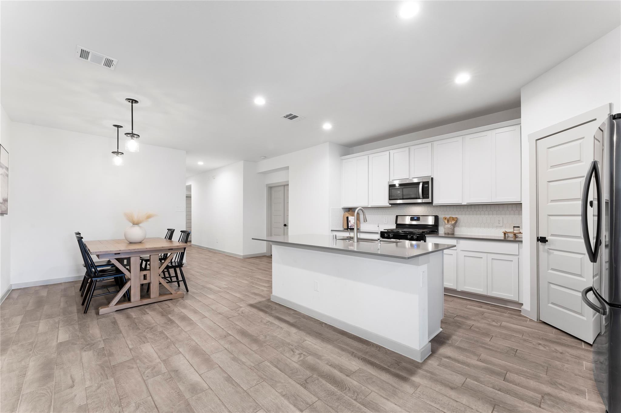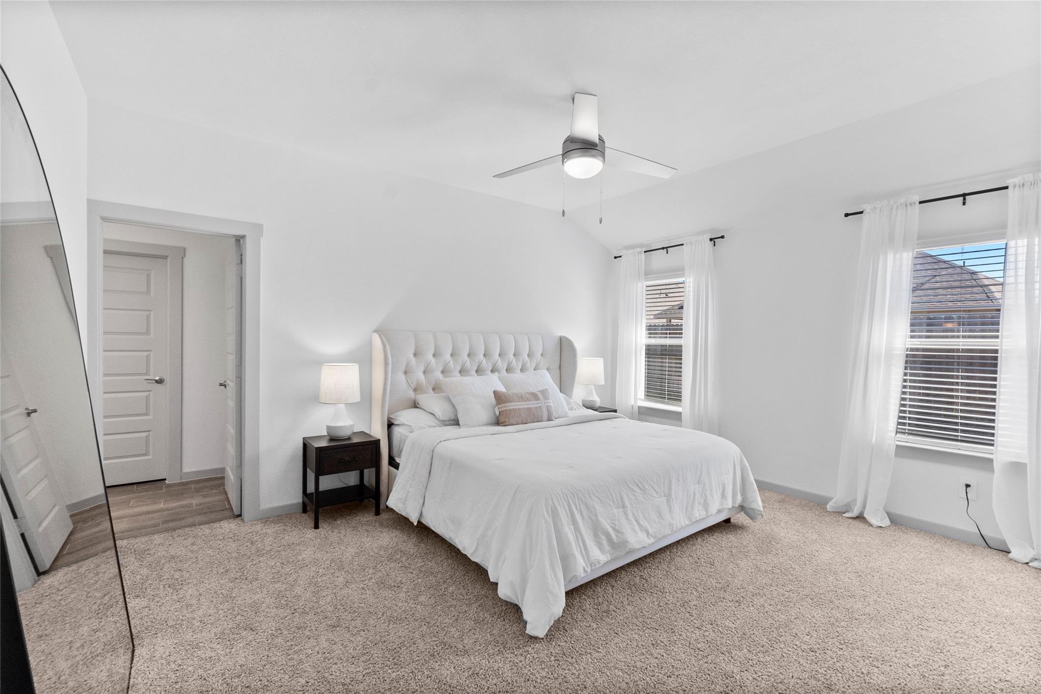 The large family room flows seamlessly into a defined dining area, creating an inviting central hub. The private primary retreat features two linen areas, double sinks, and a generous walk-in closet, perfectly designed for organization.