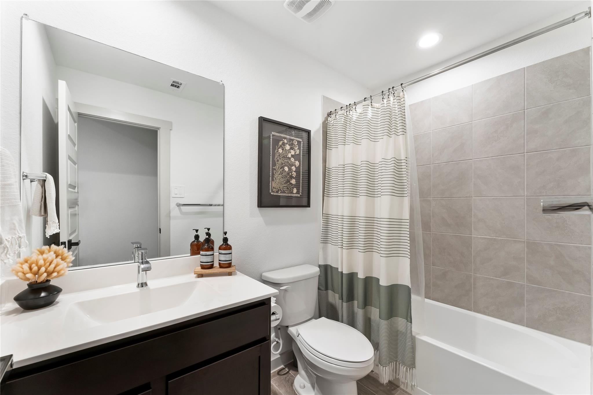 Tile plank flooring provides a sleek, modern look with effortless maintenance, while upgraded carpet in the bedrooms adds warmth and comfort. The home's bright, airy feel continues outdoors with a covered patio, plumbing in place for future enhancements, and both front and back irrigation systems.