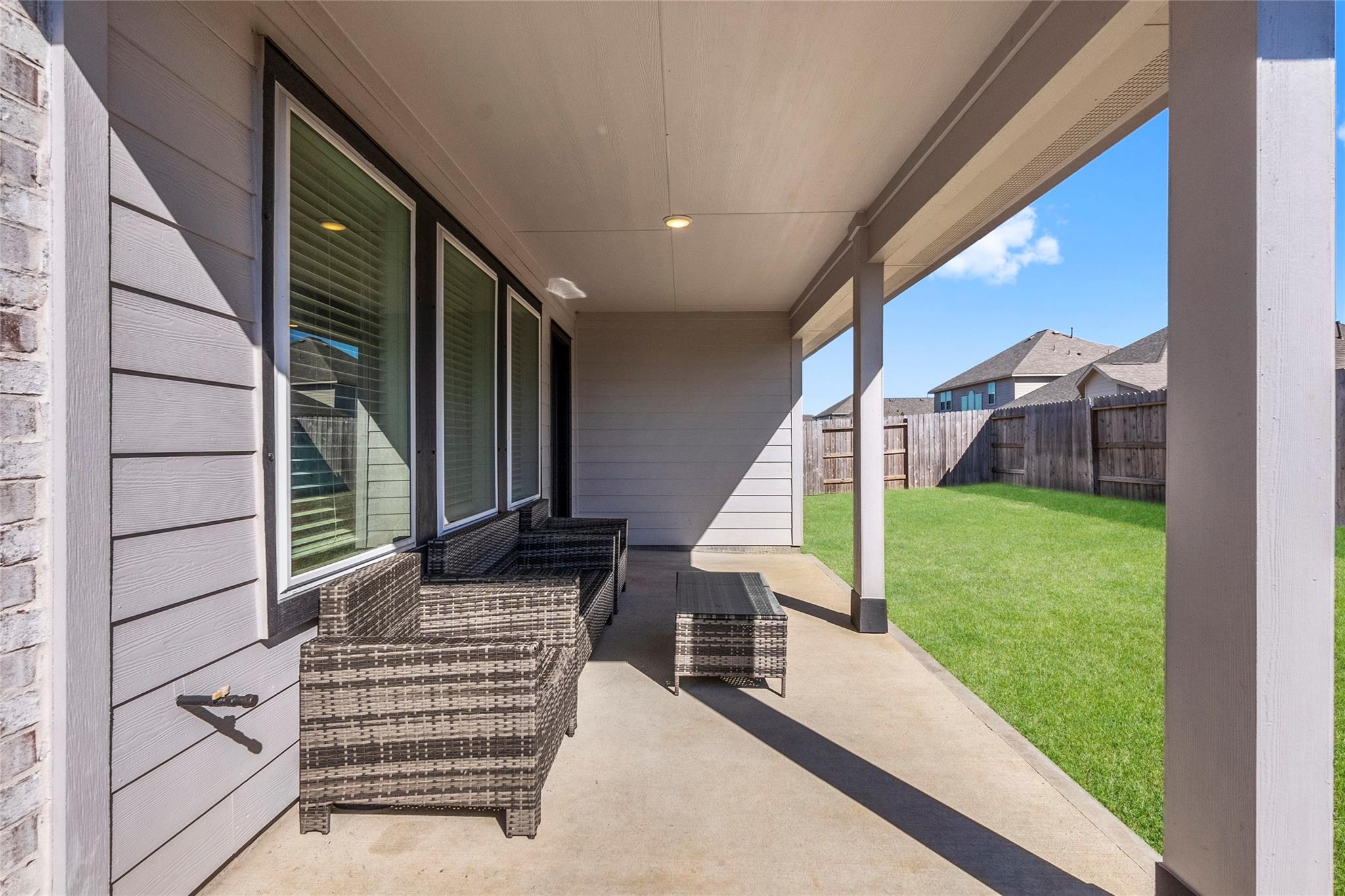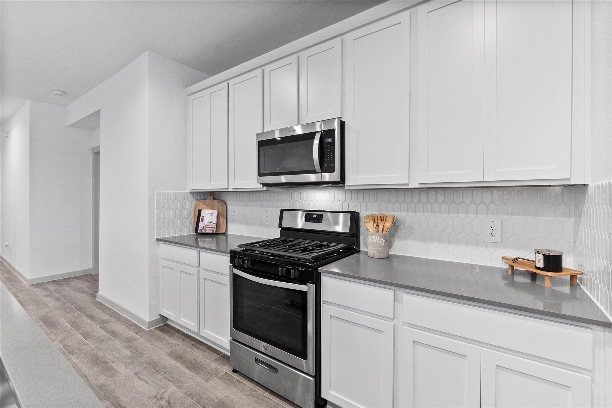 Builder Upgrades Include * Open concept floor plan with extended foyer * 42" kitchen cabinets + coffee station * Designer backsplash + high ceilings * Island seating for 4 * Stylish plank tile + upgraded carpet in bedrooms * 3-lite glass front door for elevated curb appeal *Irrigation system, Covered patio plumb for gas *Updates Light Fixtures, Ceiling fans, Faucets, Recessed outlet for tv.